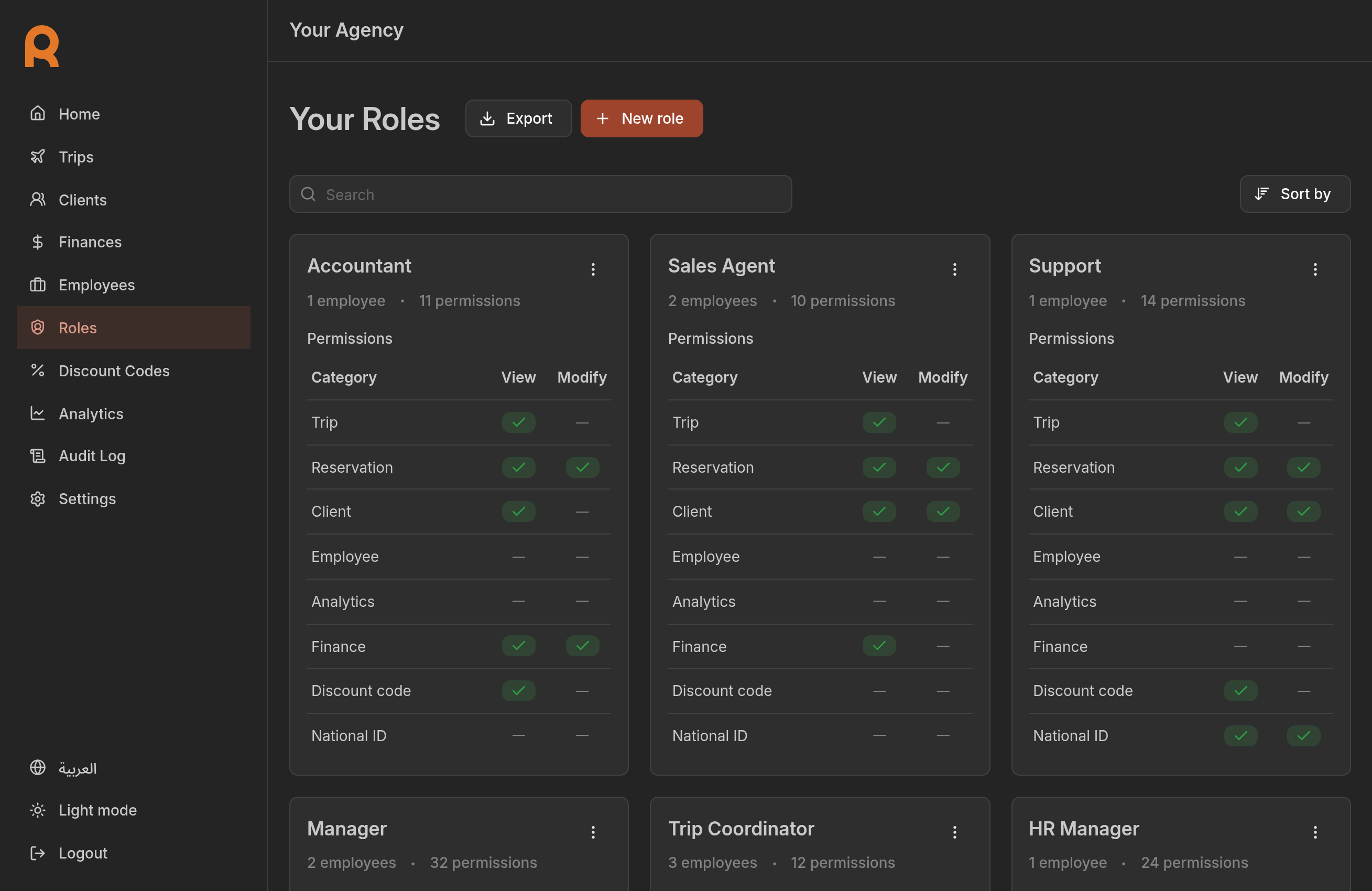You will see a list of all defined roles and how many employees are assigned to each.