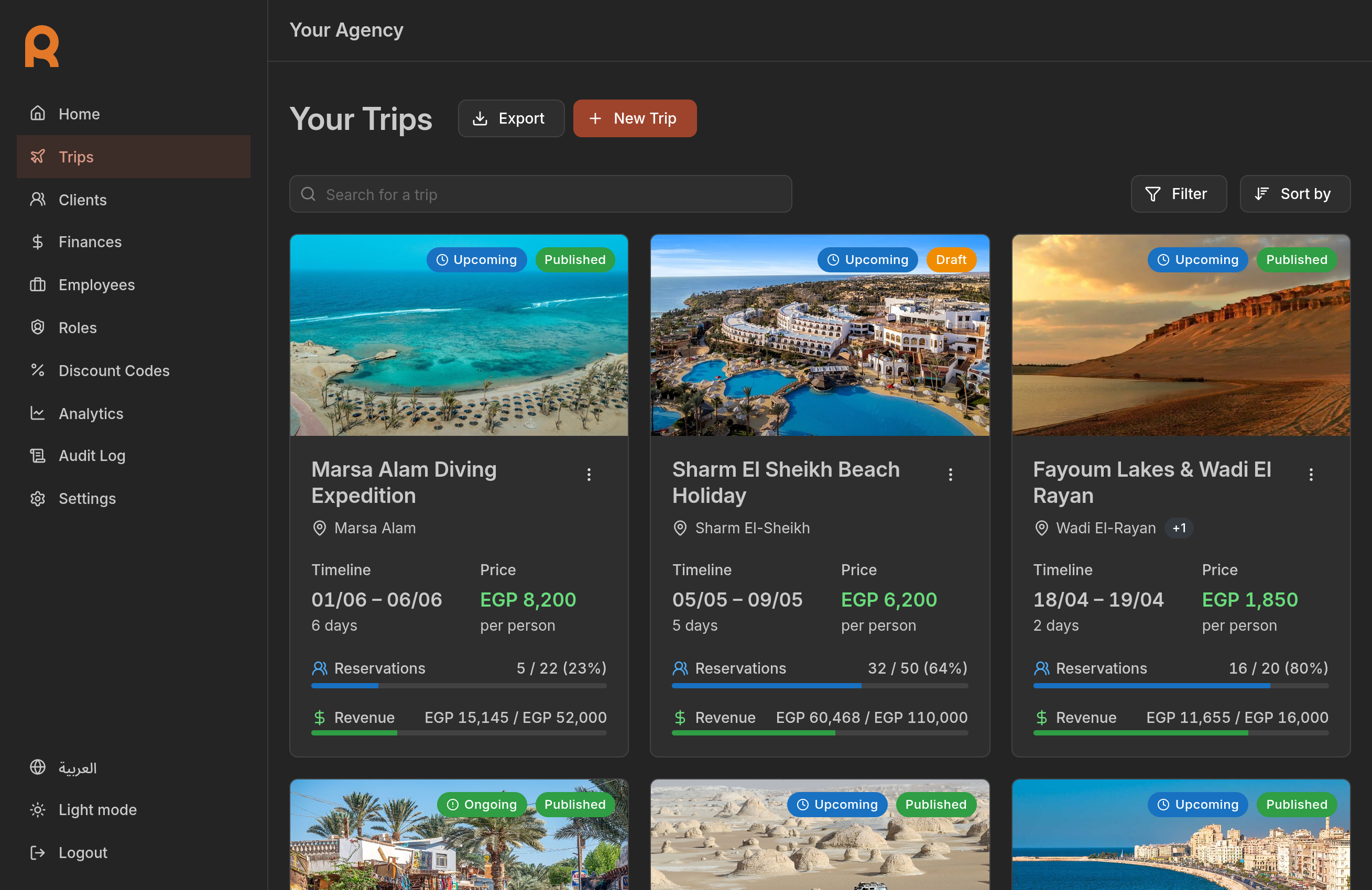 The Trips section allows you to manage your entire catalog of travel packages. From here, you can create new trips, update existing ones, and track their status from planning to completion.